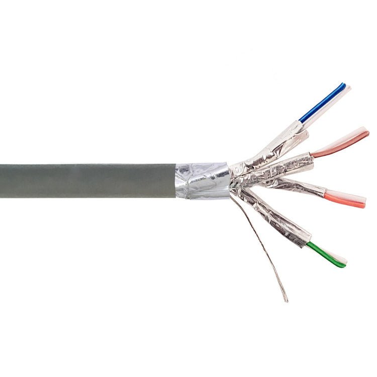 This bulk riser rated Cat6 cable is 1000 feet in length and consists of 4 pairs of 26AWG stranded wires with individually foil shielded pairs plus an overall foil shield. It is typically used to manufacture Cat6 shielded patch cables and terminated with shielded RJ45 plugs.