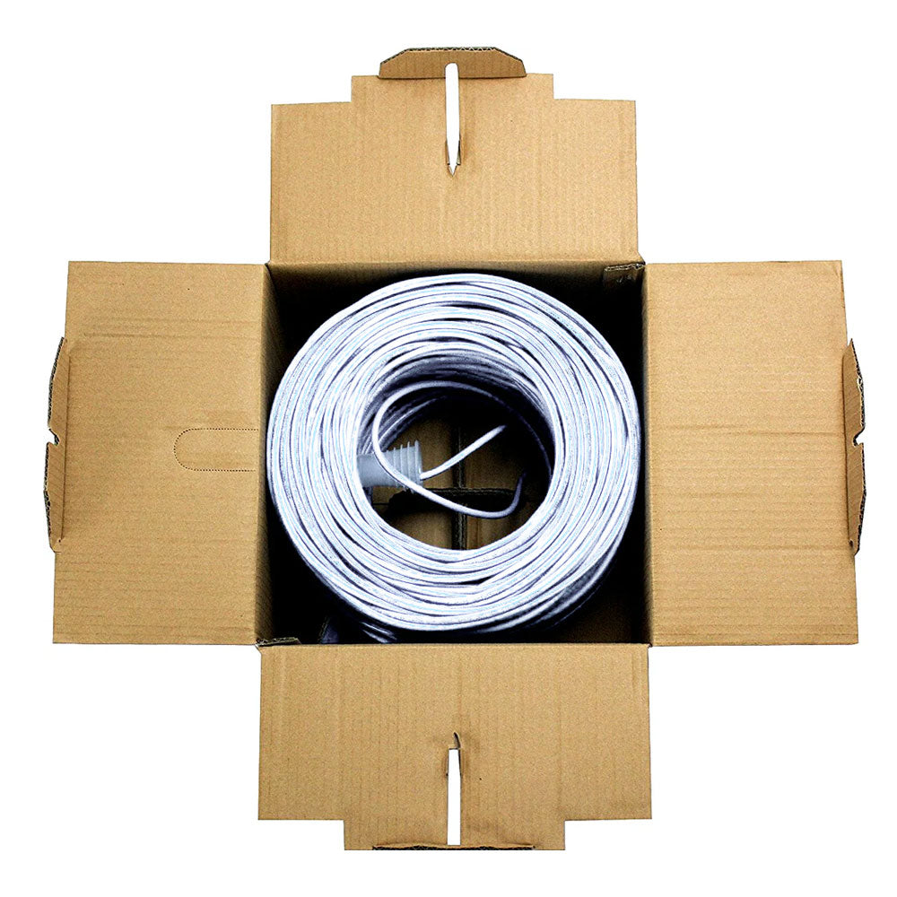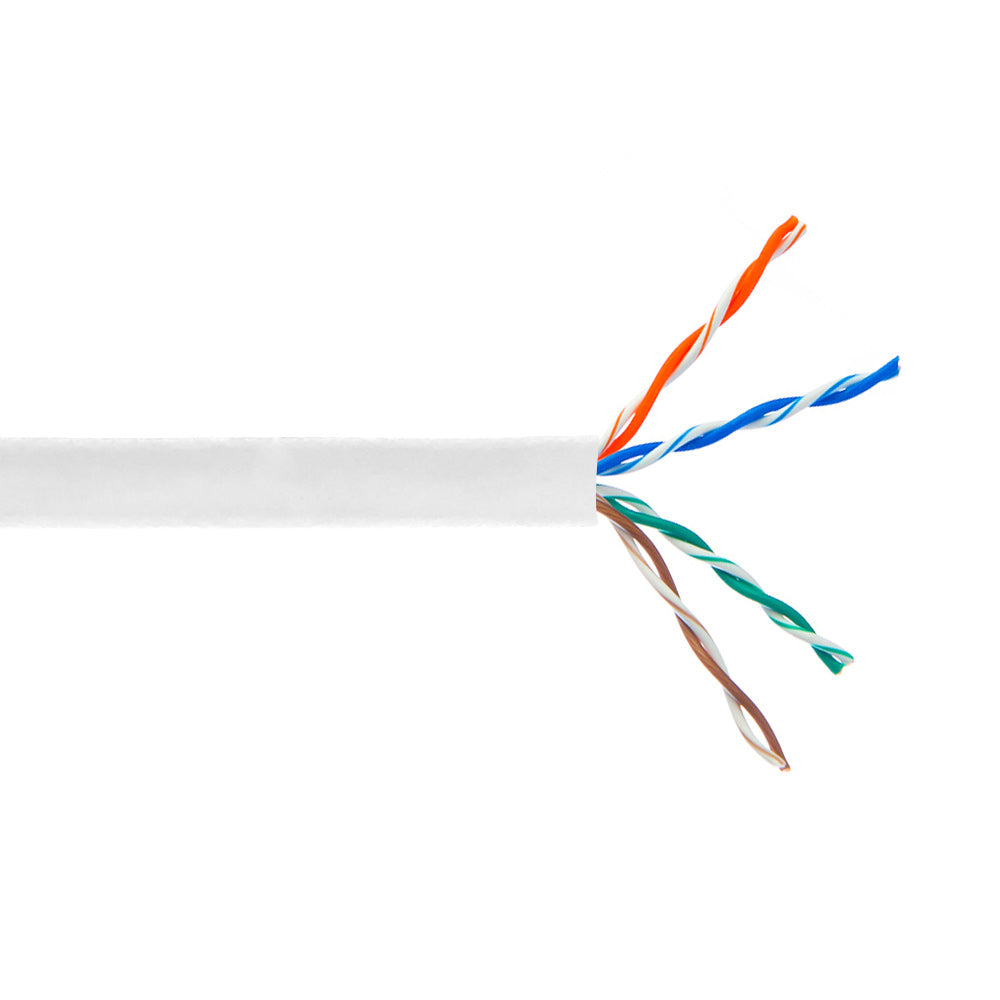 This bulk CAT5E plenum rated cable consists of 4 pairs of 24AWG solid bare copper wires. It is typically used in plenum environments as premise wiring and terminated from a patch panel to a CAT5E jack.
