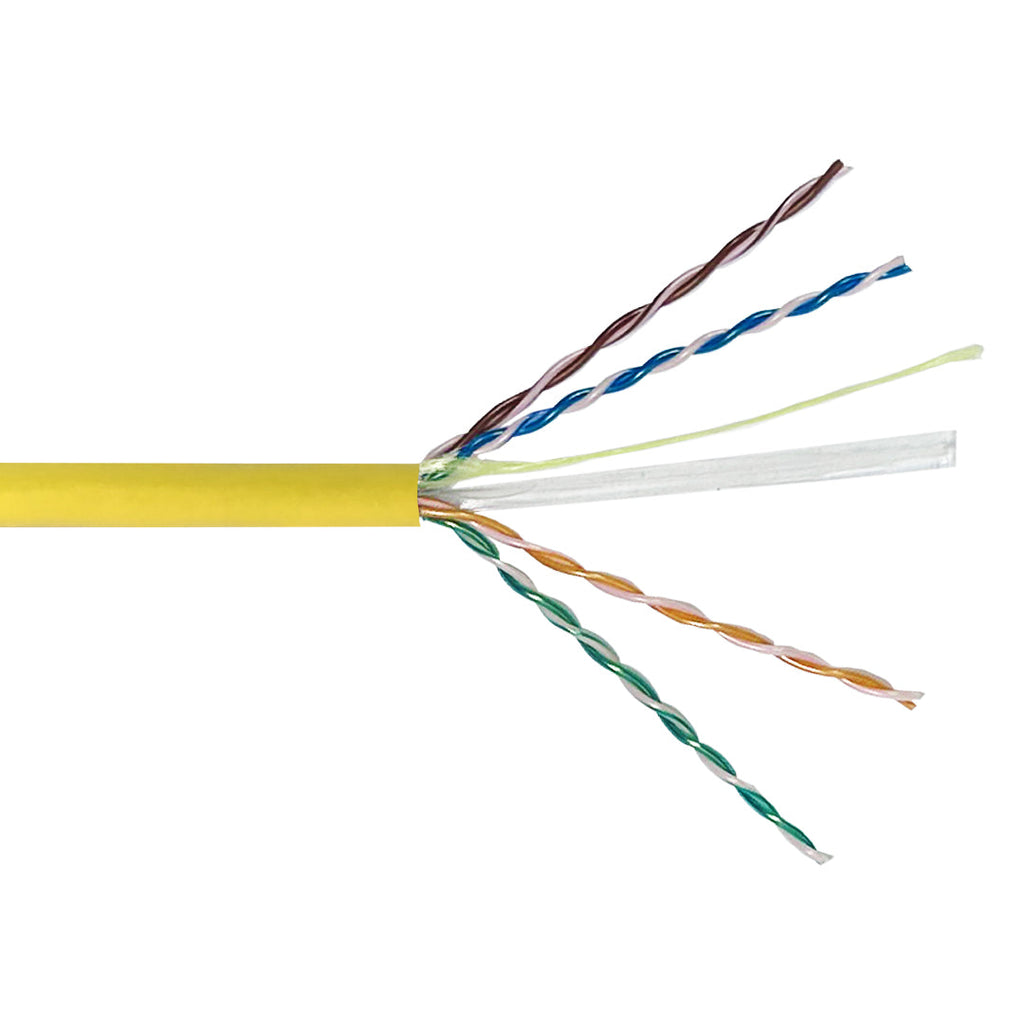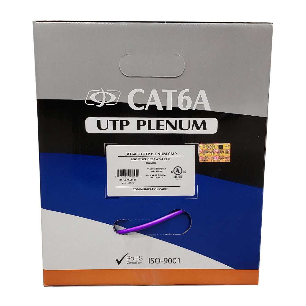 This bulk CAT6A plenum rated cable is 1000 feet in length and consists of 4 pairs of 23AWG solid bare copper wires. It is designed for use in data networking, PoE, security networking and voice applications. The cable is plenum (CMP) UL listed, RoHS Compliant and meets and/or exceeds CAT6A TIA/EIA 568 C.2 standards. It is typically used in plenum environments as premise wiring and terminated from a patch panel to a Cat6A jack.