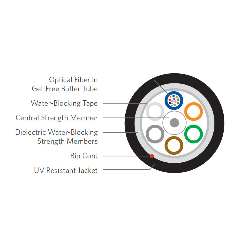 This bulk 12-strand loose tube fiber cable is outdoor rated. It is OSP rated for outside plant environments. Its loose tube design offers reliable transmission performance over a broad temperature range. Optical fibers and water-blocking elements are placed inside gel-free buffer tubes. This cable provides high fiber density, can be used for multiple network applications, reduces cable installation time, reduces number of tools required, speeds fiber access/cleanup and dielectric design eliminates grounding issues.