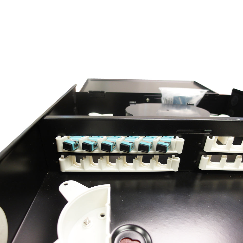 This wall mount fiber optic enclosure is meant for indoor use and can accommodate up to 24 fiber couplers (24 SC or ST simplex couplers or 24 LC duplex couplers). It is used to interconnect fiber splices and terminated fiber cables. The unit comes with five 12-fiber splice trays, four cable routing clamps, 48 splice sleeves, eight 6-port blank adapter panels and mounting hardware.