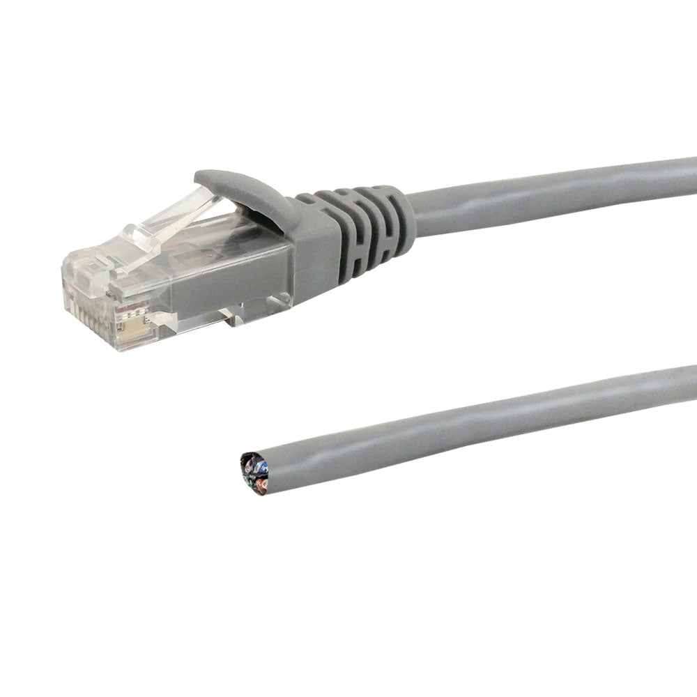 This Cat5e ethernet cable consists of a RJ45 male on one end and has no termination on the other. The un-terminated end is typically used for punching down onto a terminal block and the RJ45 end can be connected to a patch panel or pass-through coupler.
